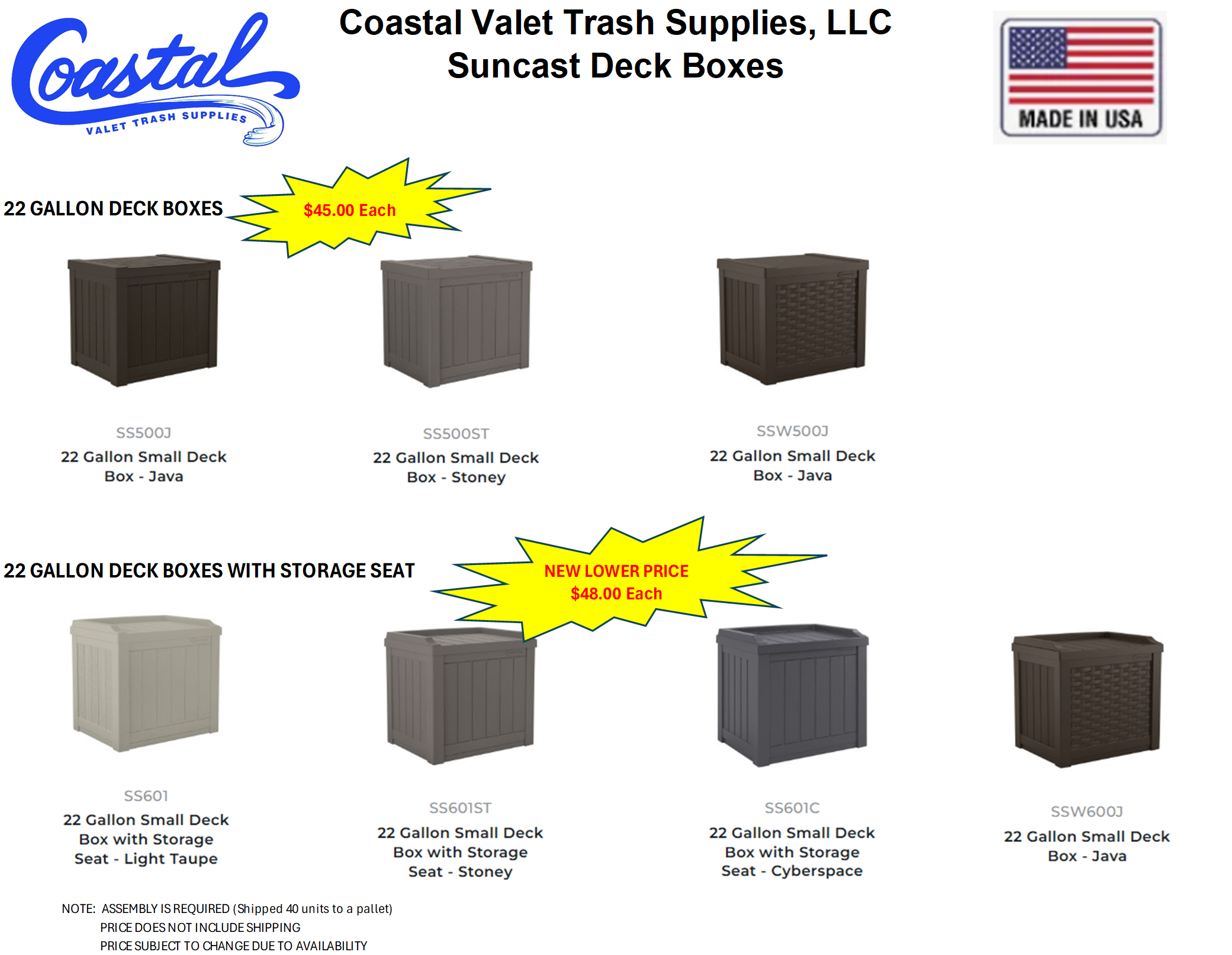 We are an official SUNCAST Distributor and we sell 22 Gallon Deck Boxes.