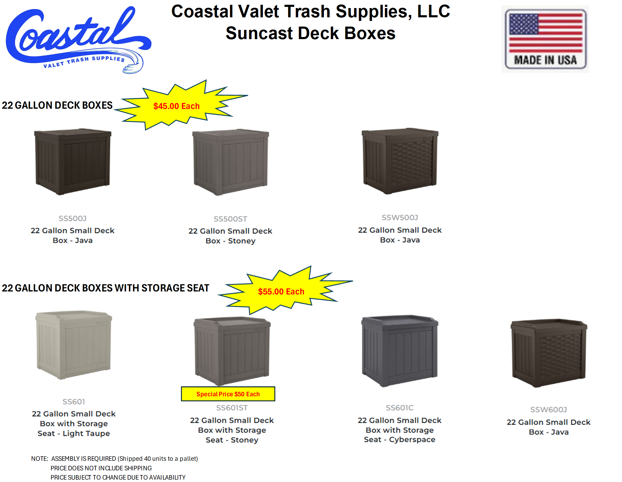 We are an official SUNCAST Distributor and we sell 22 Gallon Deck Boxes.